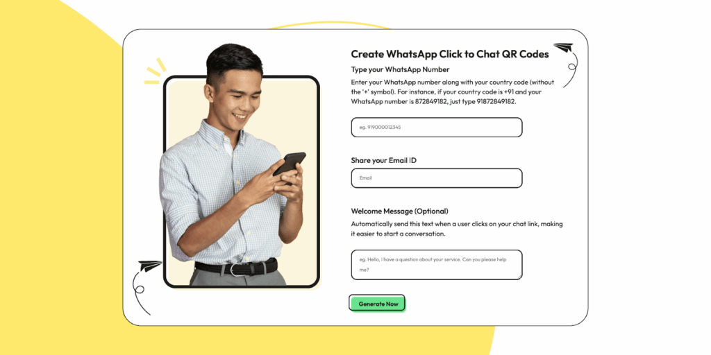 QR Codes are a brilliant way to bridge your offline and online presence. A customer can scan a QR code on your product packaging, business card, or storefront to instantly start a WhatsApp chat, removing the need to manually type or save your number.