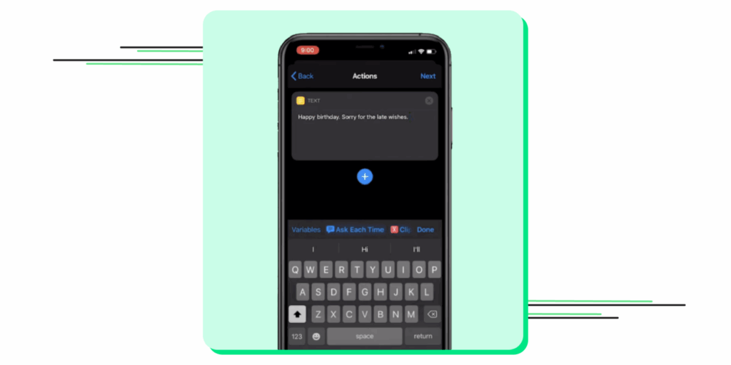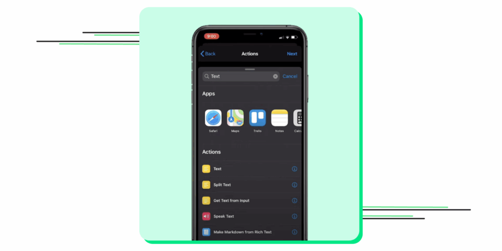 5. Add Your Message Action: Tap “Next,” then “Add Action.” In the search bar, type “Text” and select the “Text” option from the results. In the text box that appears, type the exact message you want to schedule.