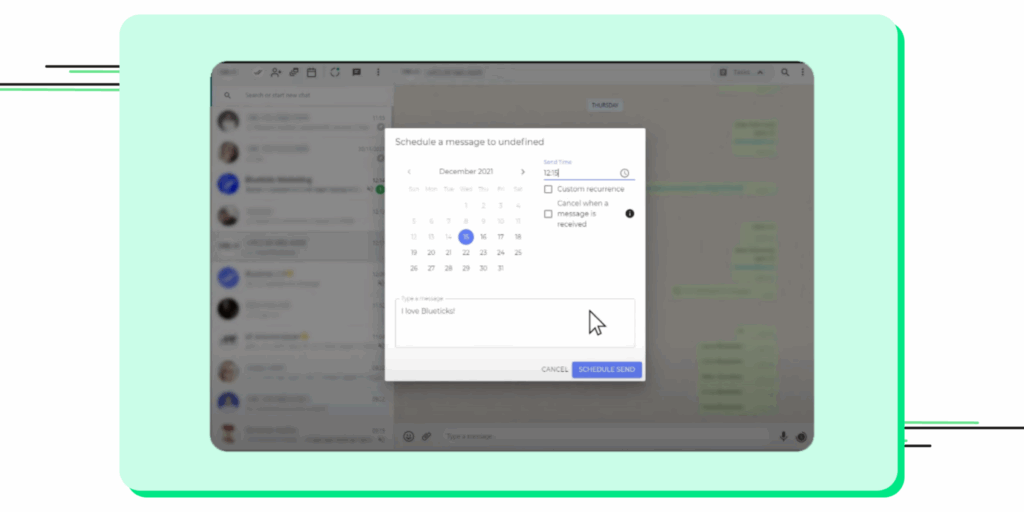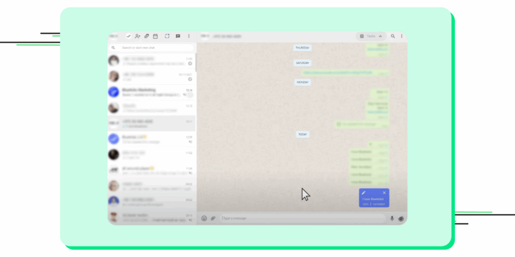 If you attribute WhatsApp engagement to a browser, scheduling messages directly from your browser can be incredibly efficient. The best way to do this is with a Chrome extension, such as Blueticks.