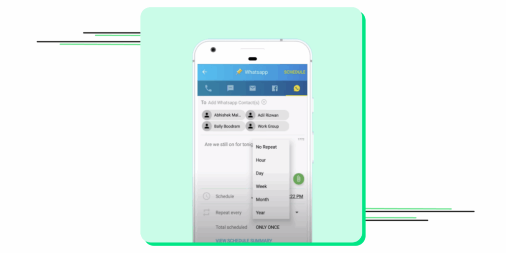 4. Craft and Schedule Your Message: Tap “Add WhatsApp Recipient” and choose the contact or group from your list. Type out the message you want to send. You can even attach images, videos, or documents. Set your desired date and time. You can also choose to repeat the message at regular intervals (perfect for weekly team check-ins!).