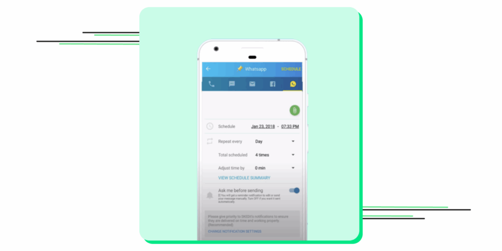 Note: With SKEDit, you cannot schedule multiple messages simultaneously. Also, before you save, you’ll see a toggle for “Ask me before sending.” If you turn this off, the message will be sent automatically without any user interaction.