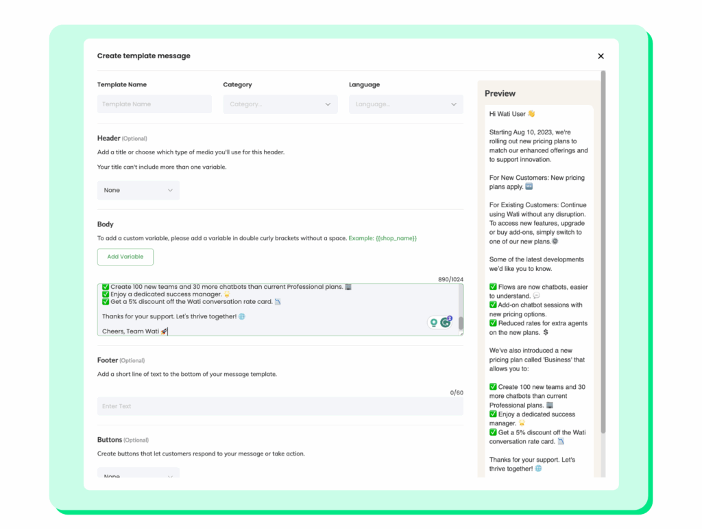 Take the time to write a compelling message that resonates with your audience. Keep it concise, clear, and relevant. Alternatively, you can choose from Wati’s pre-designed message templates that align with your campaign’s goals and brand voice.