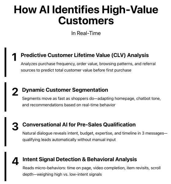 It analyzes returning visitors through signals like purchase frequency, average order value, time between purchases, and product preferences. For new visitors, it looks at referral sources, landing pages, and early browsing behavior to find patterns that mirror your highest-value customers.