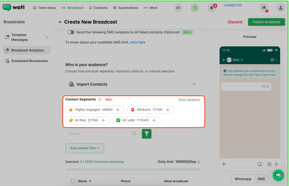 It’s a one click process. When you create a new broadcast, go to the “Segments” dropdown menu. Instead of manual filtering, just select a ready made segment like “Highly engaged” or “At risk” which is based on contact data. Wati automatically targets the contacts in that group.
