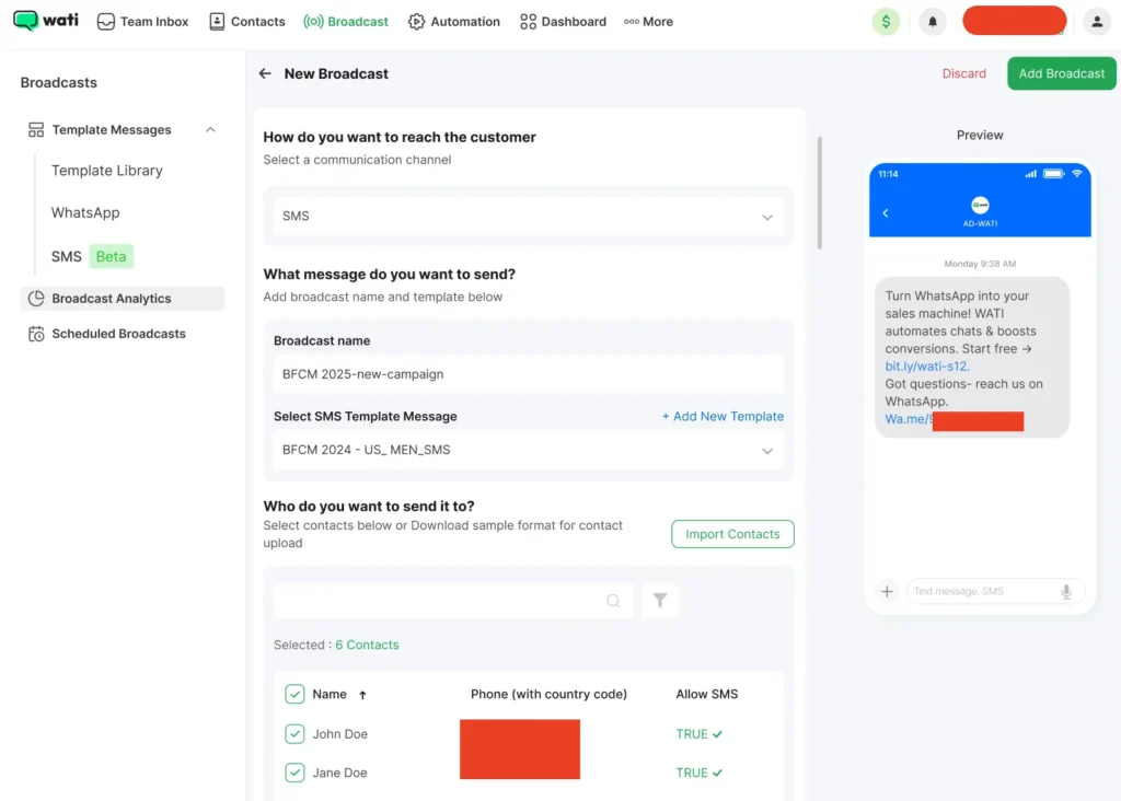 Wati platform showing unified WhatsApp and SMS broadcast interface.