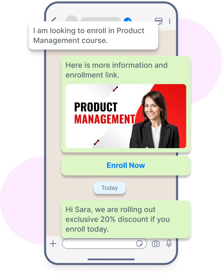 Run targeted WhatsApp campaigns for new launches, promotions, or event reminders. An edtech company can send automated reminders to registered participants before a webinar.