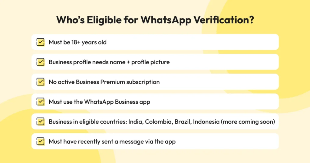 | According to Meta, here’s what makes a business eligible for WhatsApp verified business accounts: – The WhatsApp account owner must be at least 18 years old. – Your business profile should include a name and profile picture. – You cannot have an active WhatsApp Business Premium subscription. – Your business must be active on the WhatsApp Business app. – You need to be in a country where Meta Verified for WhatsApp is available (currently India, Colombia, Brazil, and Indonesia, with more regions being added soon). – You must have recently sent a message through the WhatsApp Business app. |