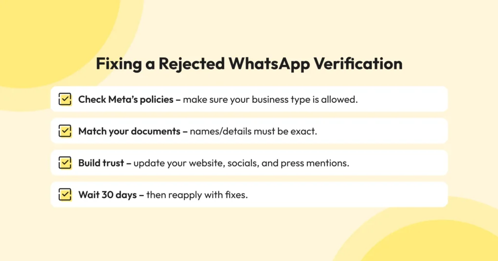 Double-check your submitted documents, ensure your business complies with WhatsApp policies, and reapply after correcting any issues.